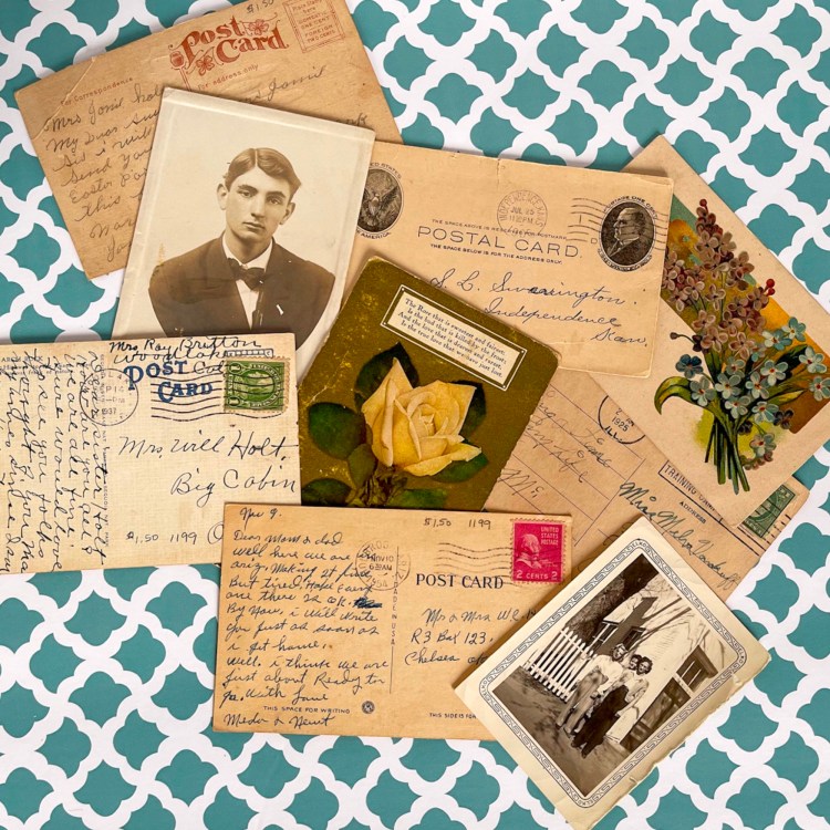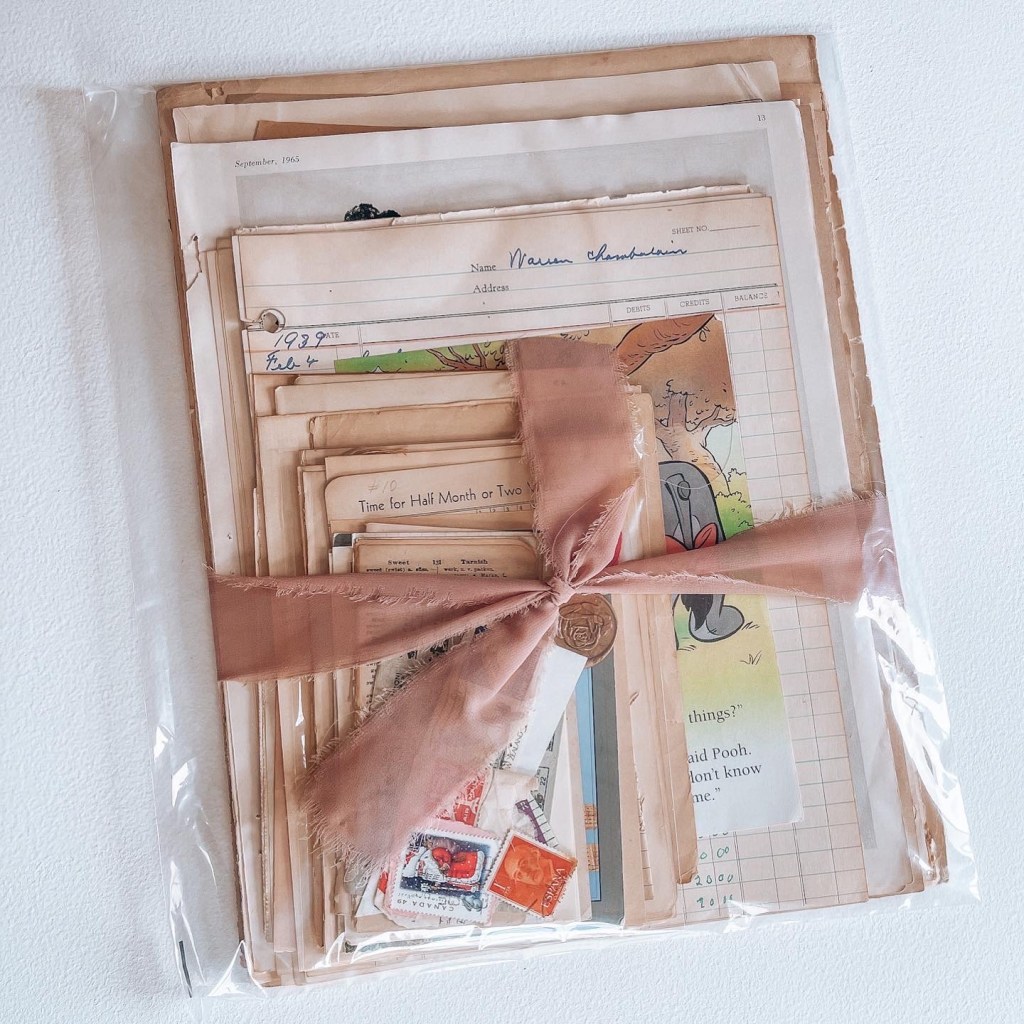 In each pack, I try to include a variety of sizes, textures, and items. I always try to include photographs if I have them. I include lots of different types of book pages. Some that include text, illustrations, aged edges and marks. I always include pieces with handwriting, such as postcards, letters, and old envelopes. I like to include old documents and banknotes. It’s my goal to have a well-rounded pack that offers lots of options to the buyer. Overall, the key is to carefully curate a selection of items that are visually interesting and historically significant.